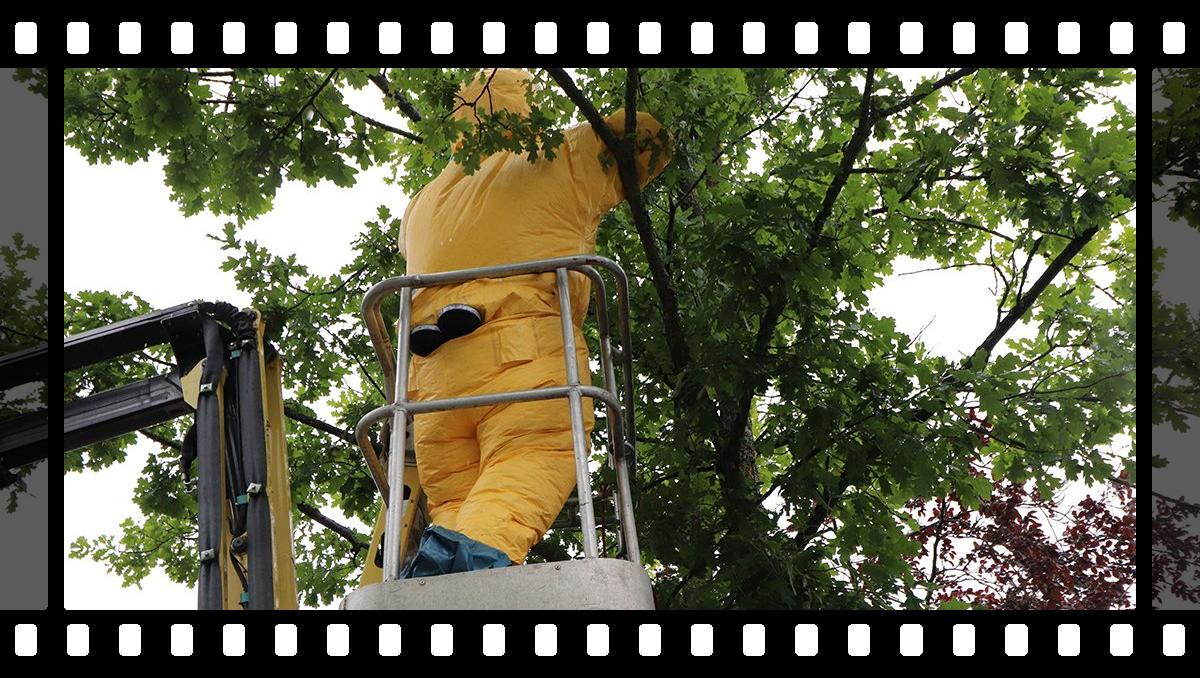 Anfang Juni 2020 hatten wir von unserem Kunden den Auftrag erhalten, eine Eichenprozessionsspinner-Beseitigung durchzuführen. Insgesamt waren drei Bäume befallen. Wie man auf den Bildern sehen kann, erfolgt unser Einsatz immer mit professioneller Ausrüstung. Ein Schutzanzug mit Sauerstoffzufuhr, kombiniert mit Filtern ist hier das A und O.