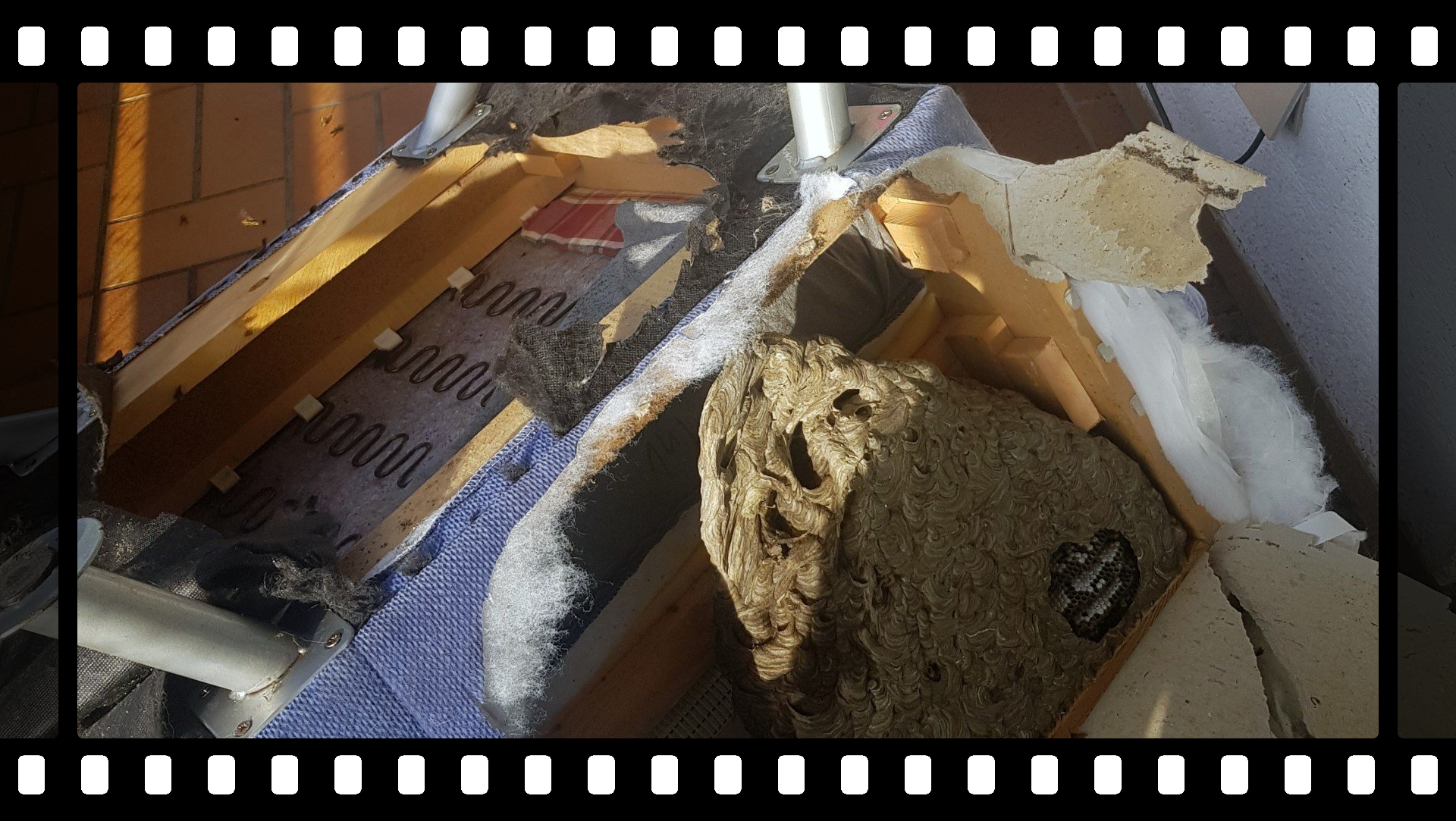 … so auch in diesem Fall. Auf dem Balkon eines Kunden hatten sich Wespen einen Sessel für ihren Nestbau ausgewählt. Um das Nest zu entfernen, musste das Seitenteil des Sessels aufgeschnitten werden. Eine Angelegenheit, bei der eine entsprechende Ausrüstung notwendig ist, sodass niemand verletzt wird. Eindeutig eine Sache für den Fachmann.